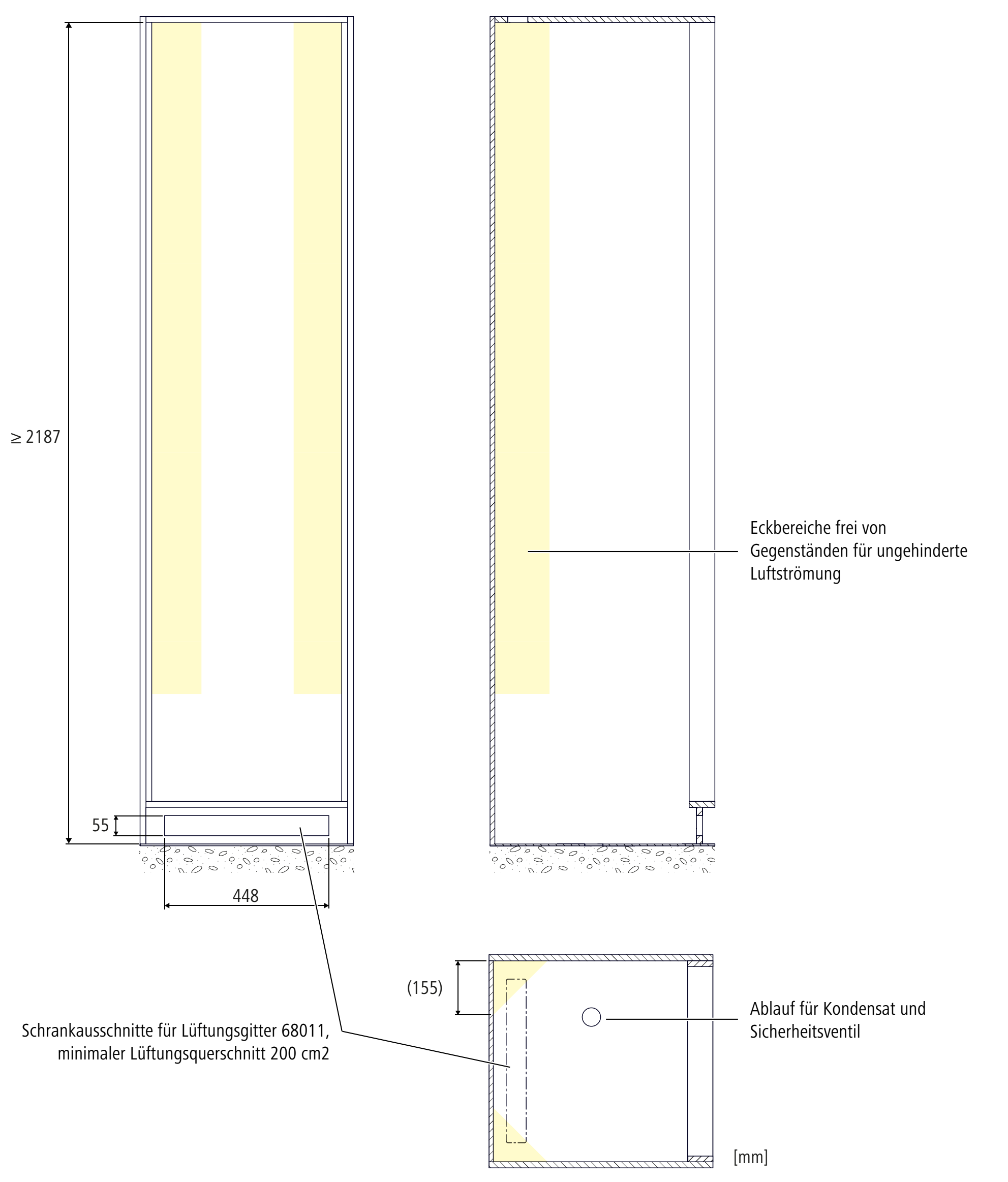 Je nach Einbausituation müssen zusätzliche Abdichtungen im Schrank montiert werden, um einen strömungstechnischen Kurzschluss (Ansaugen von Abluft) aufgrund von Öffnungen zu verhindern.