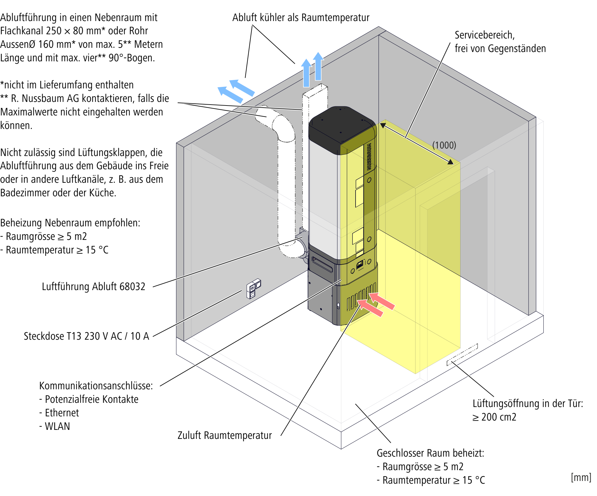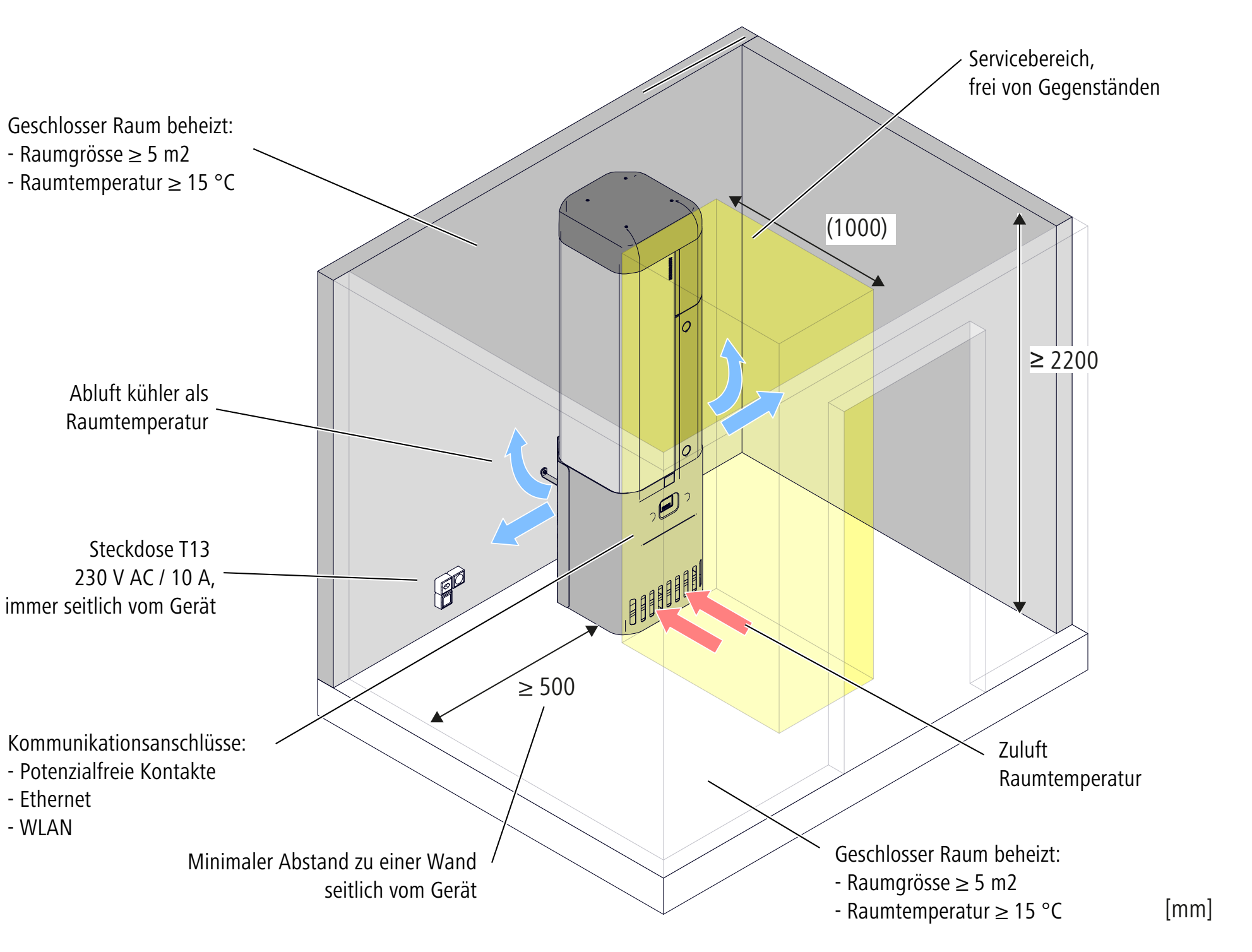 Bauseits ist ein zur Atmosphäre hin offener Ablauf erforderlich, der sich unter oder direkt neben dem Gerät befinden muss.