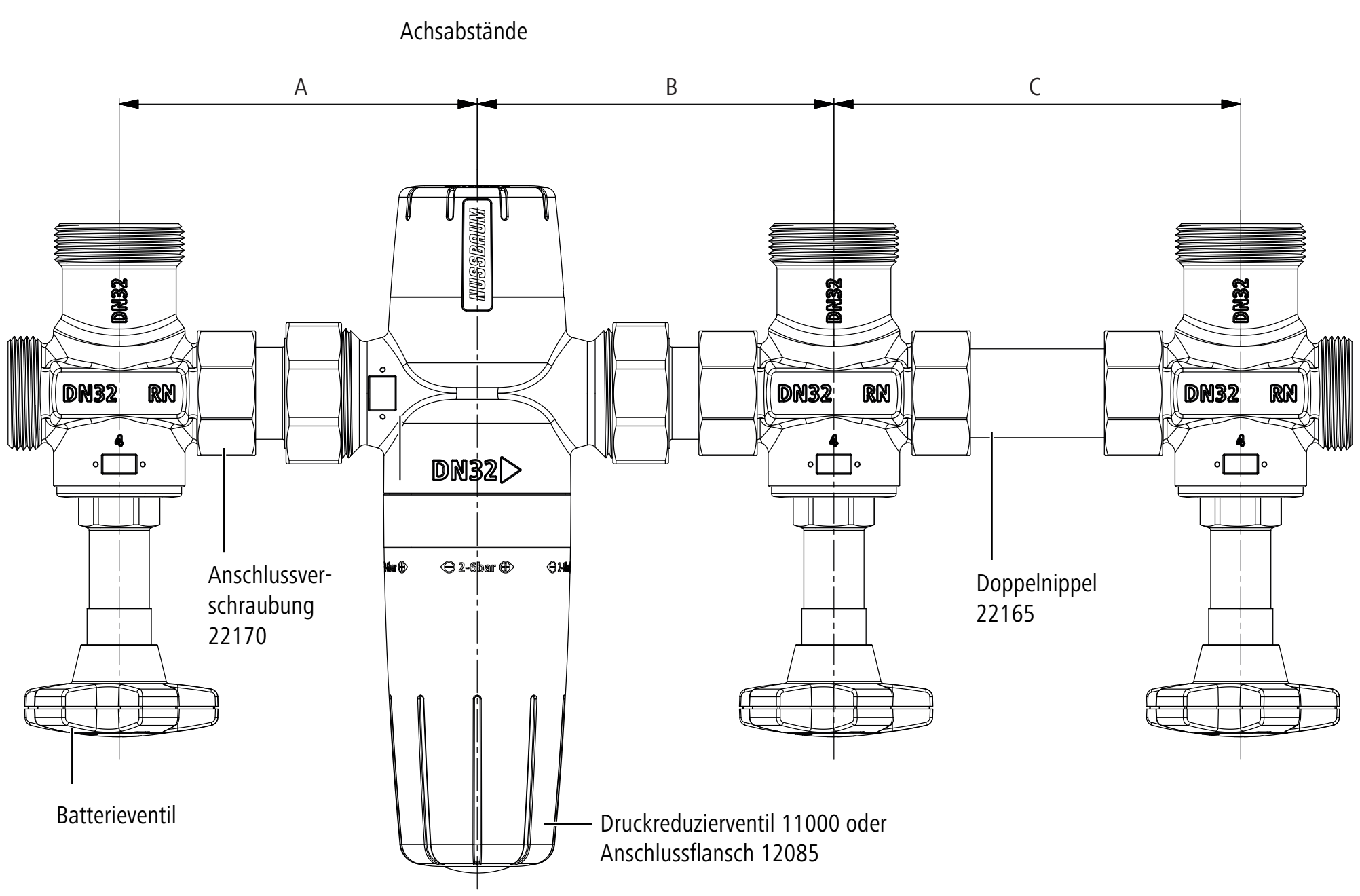 Die Achsabstände zwischen den Batterieventilen sind abhängig von der Grösse (DN) der eingesetzten Armaturen und Fittings: