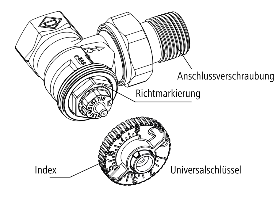 - Universalschlüssel abziehen. Einstellwert kann am Ventiloberteil aus Betätigungsrichtung abgelesen werden.