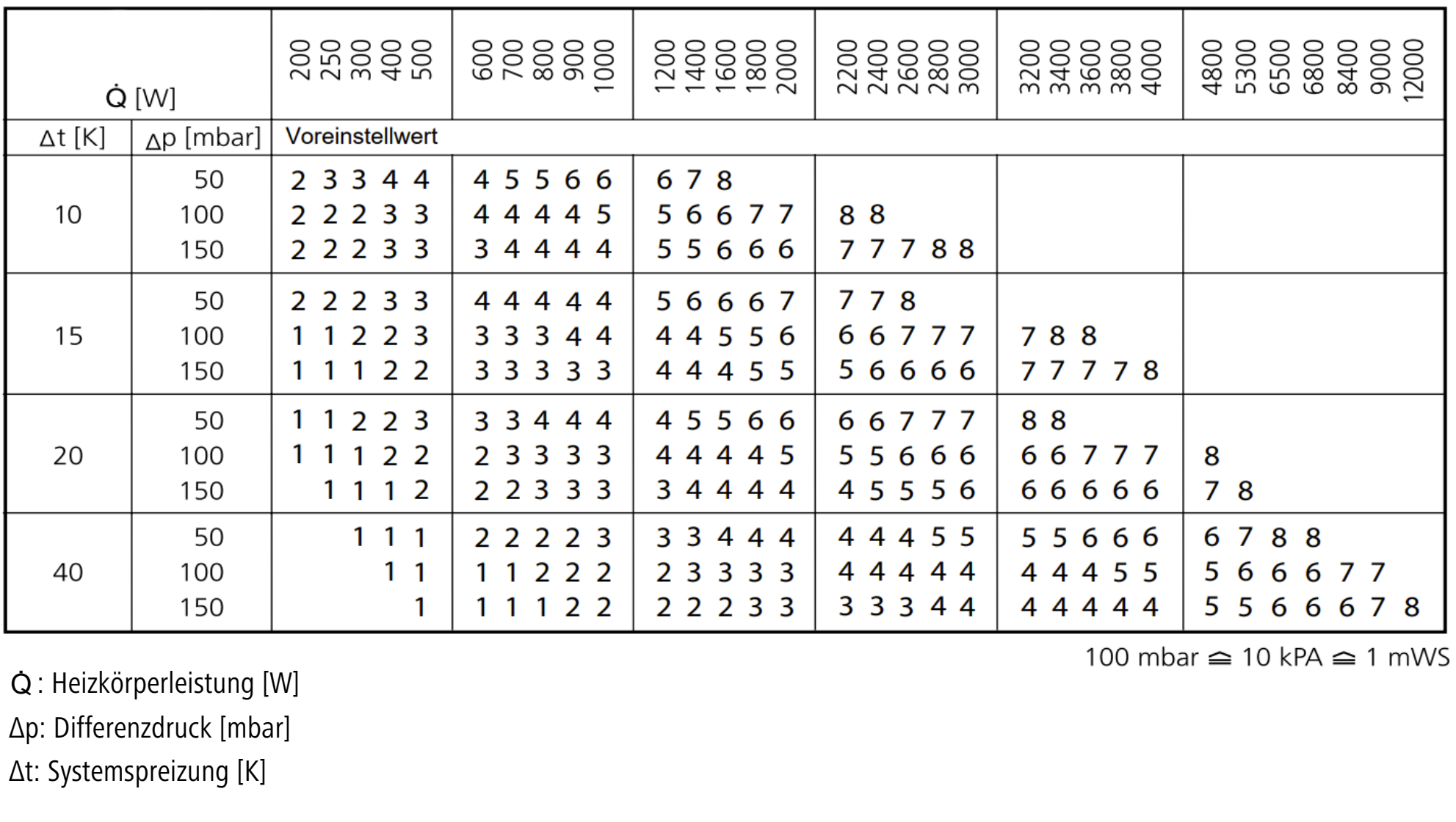 Empfohlene Voreinstellwerte in Abhängigkeit von Heizkörperleistung, Differenzdruck und Systemspreizung:
