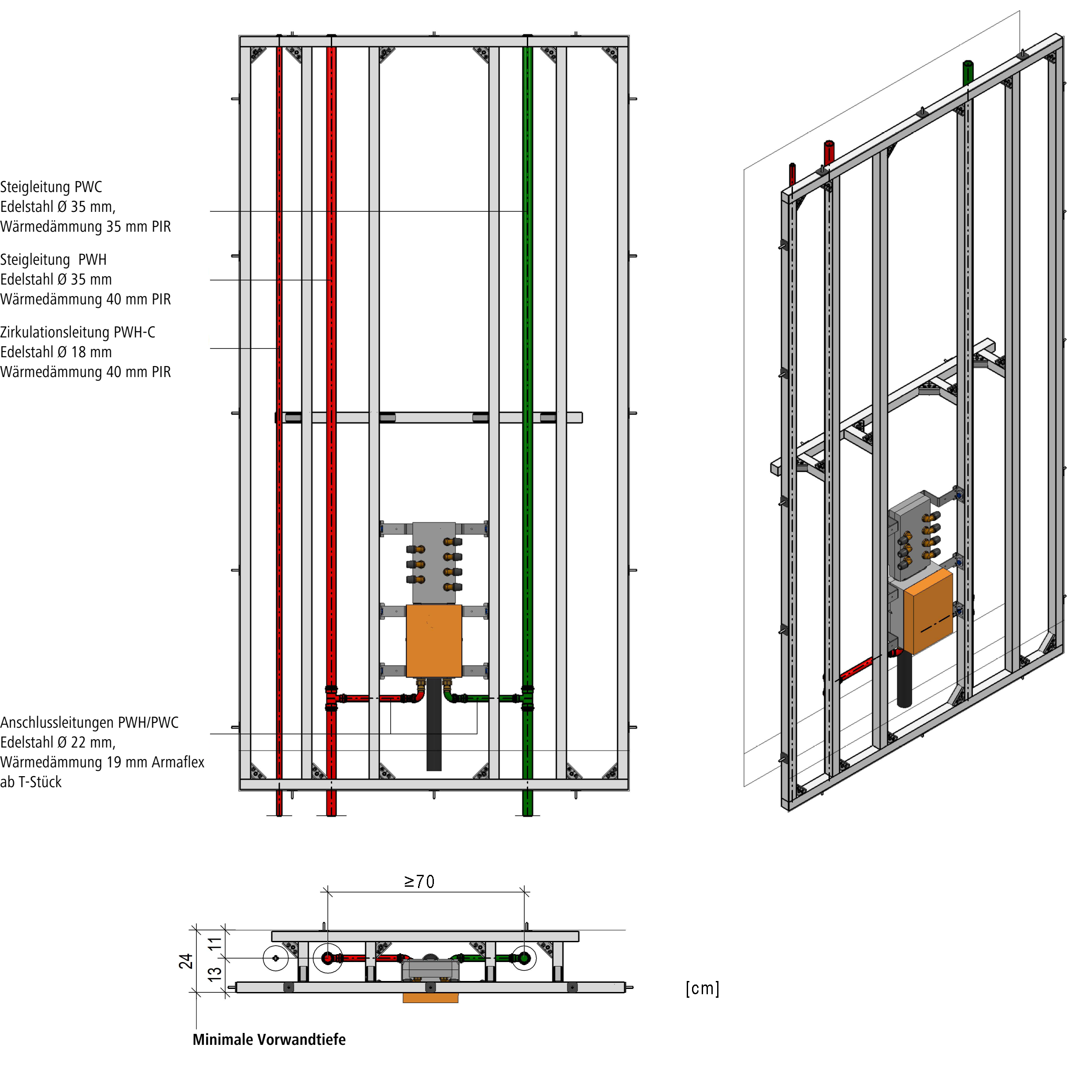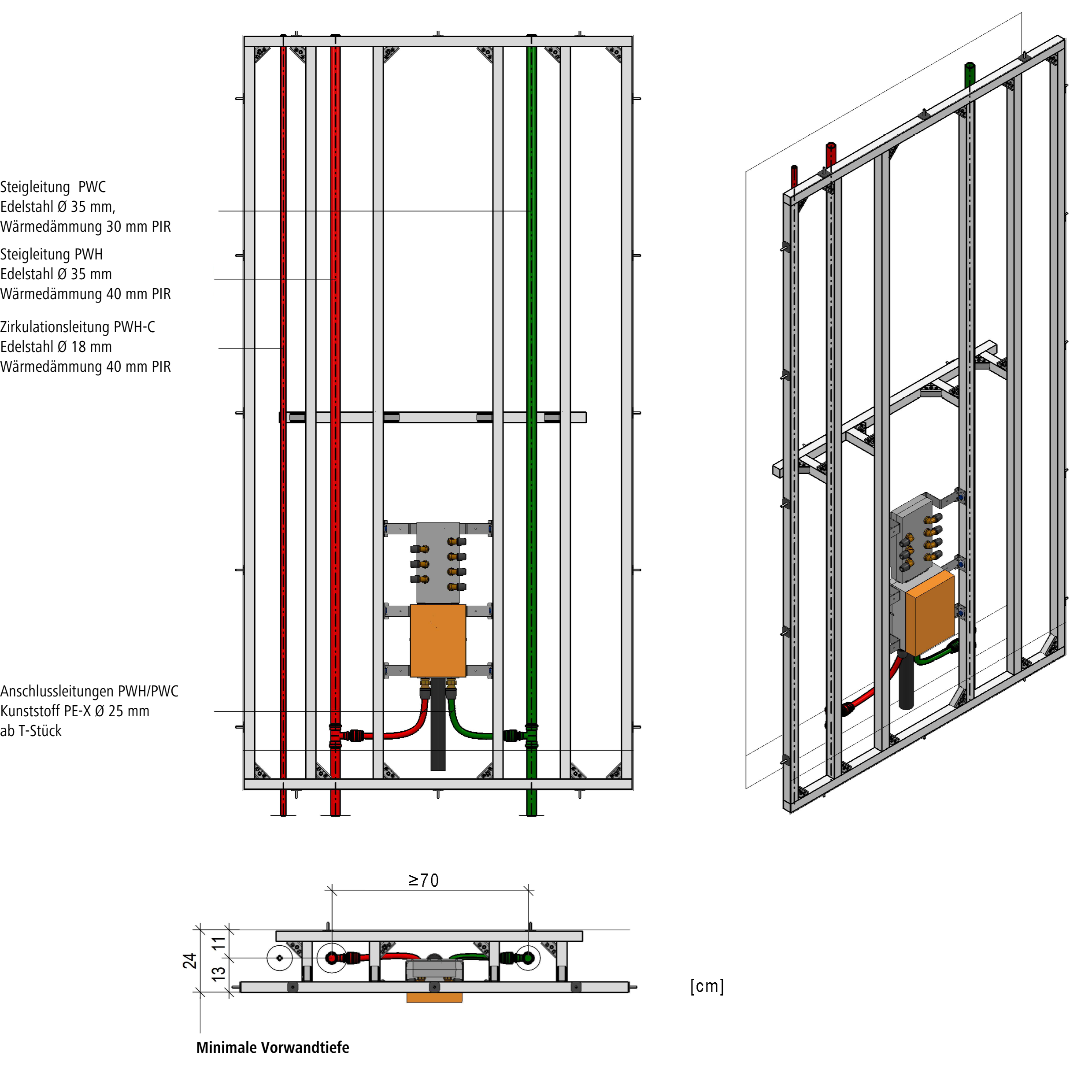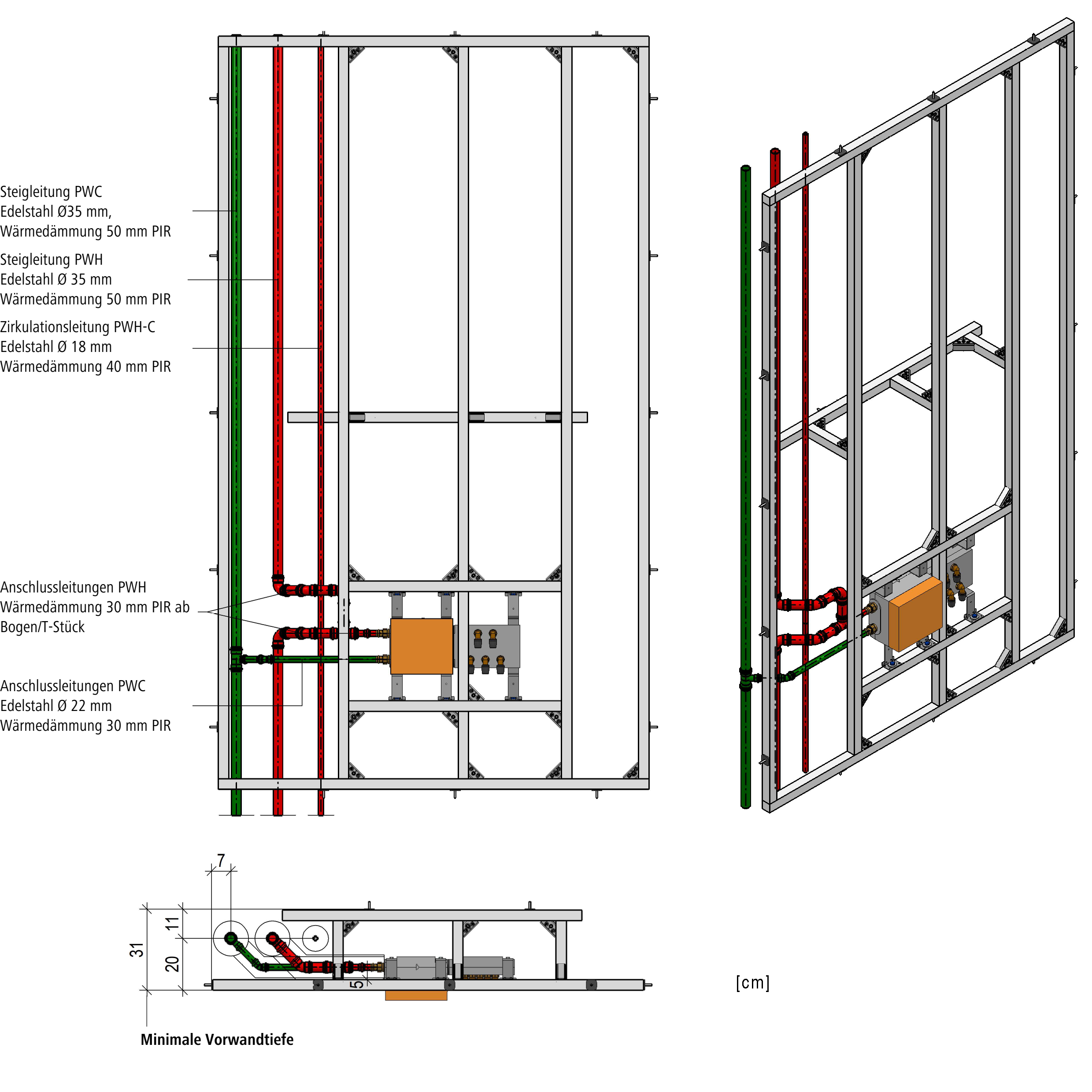 Im Folgenden werden drei praxisnahe Lösungsbeispiele von Vorwandinstallationen aufgeführt. Ein Beispiel zeigt eine Lösung mit verstärkter Wärmedämmung der Kaltwasserleitungen. Die weiteren Beispiele zeigen mögliche Lösungen mit thermischer Trennung durch Mindestabstand zwischen den Steigleitungen.