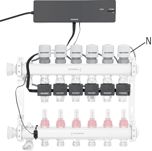 réglage intelligent pour chauffage et refroidissement, pour chauffage au sol, pour dalle active, comprenant unité de base de réglage Therm-Control, servomoteur Therm-Control, sonde de température de retour Therm-Control, sonde de température de contact Therm-Control, câble ruban Therm-Control