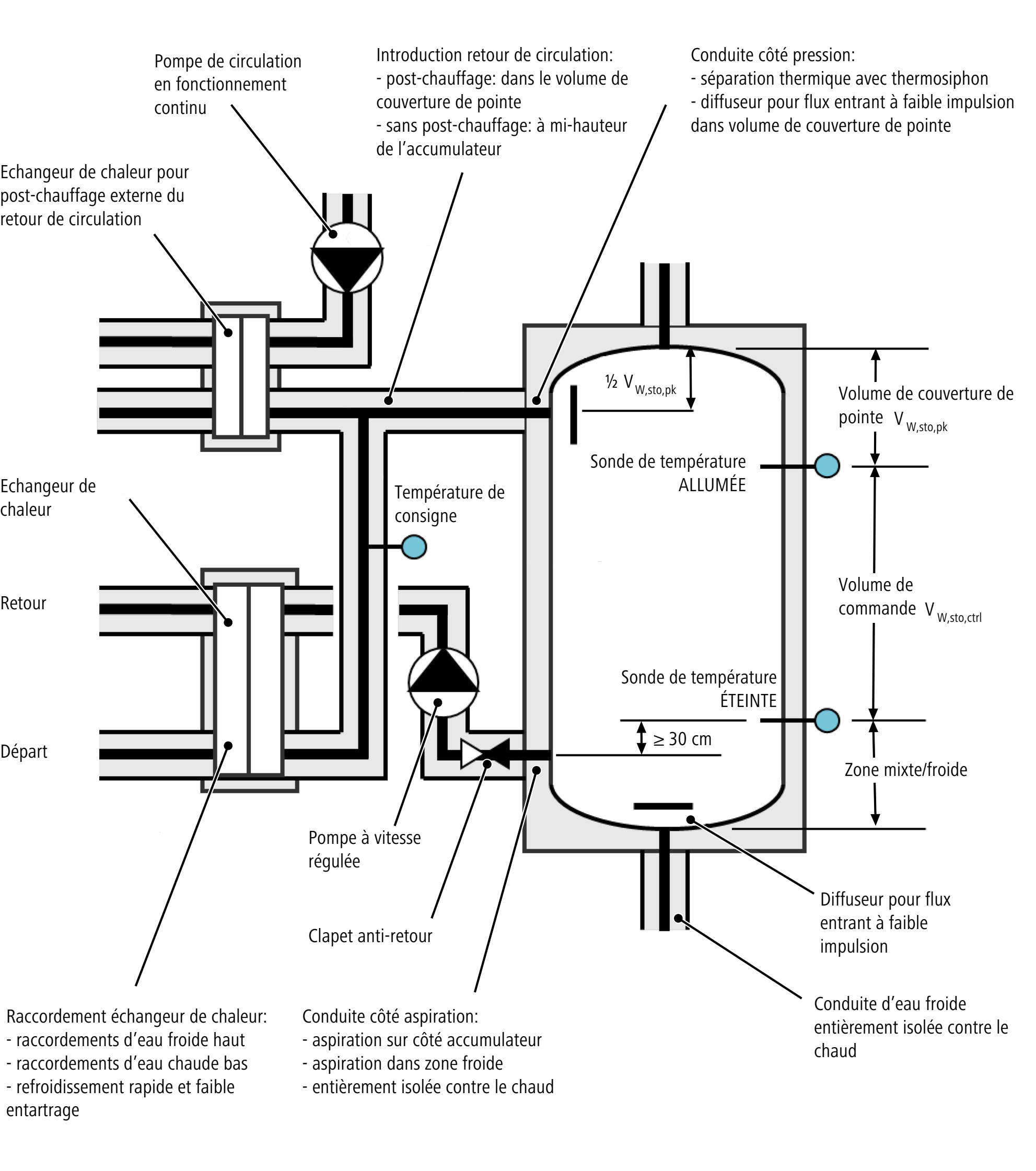 Il convient d’effectuer un post-chauffage de circulation en dehors de l’accumulateur. Une fois post-chauffée, l’eau de circulation peut être pompée dans la partie haute de l’accumulateur. Ainsi, en cas de dysfonctionnement du post-chauffage de circulation externe, la température de l’eau chaude qui circule dans l’accumulateur est maintenue (l’expérience montre que la transmission thermique du post-chauffage de circulation externe ne fonctionne souvent pas correctement).
