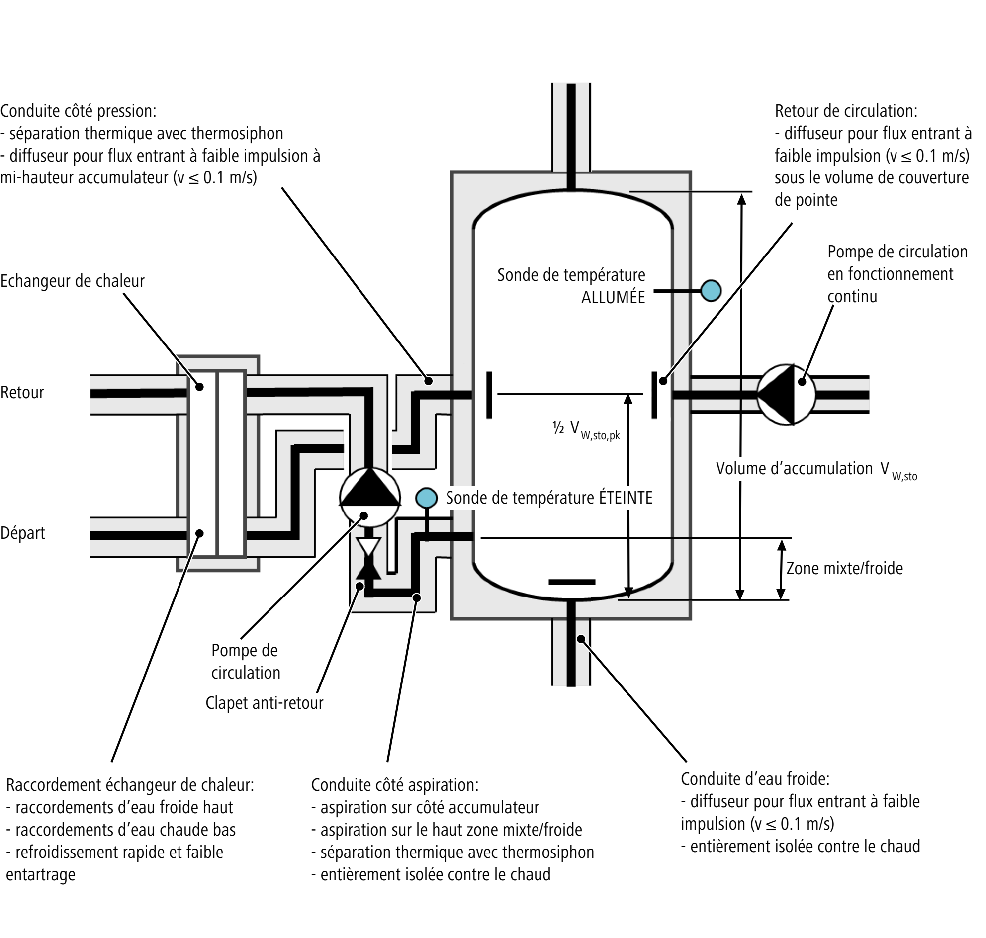 Lorsque l’eau de circulation est post-chauffée uniquement par l’accumulateur, il faut empêcher une perturbation de la stratification en faisant en sorte que le raccordement à l’accumulateur du retour de circulation se situe sous le volume de couverture de pointe. Il faut en plus que soient prises les mesures mentionnées plus haut, à savoir des diffuseurs et des vitesses de débit réduites.