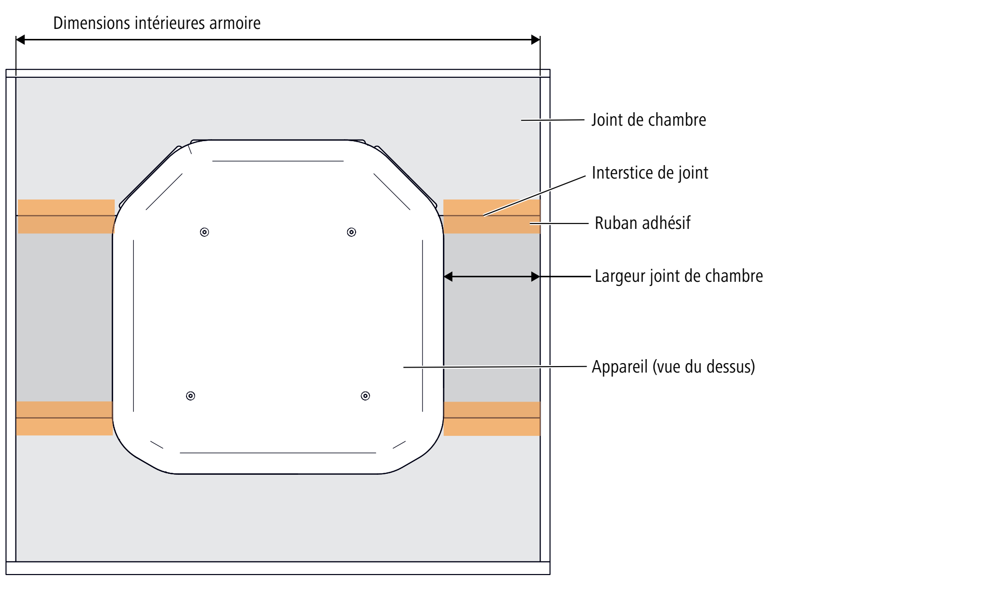Le joint de chambre adéquat dépend des dimensions intérieures de l’armoire. Lorsque l’élément d’étanchéité fait plus de 110 mm de largeur, il faut appliquer du ruban adhésif 68024.51 sur les interstices de joint. Les joints de chambre de très grand format doivent être réalisés avec des éléments rigides. Sinon, il existe un risque de manque d’étanchéité du fait d’une capacité portante ou d’une stabilité insuffisantes.