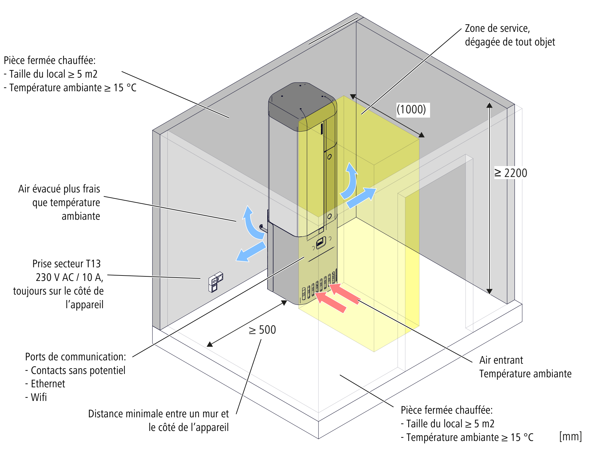 Plage de température: 15 … 35 °C, hors de cette plage de température, la pompe à chaleur se met hors tension.