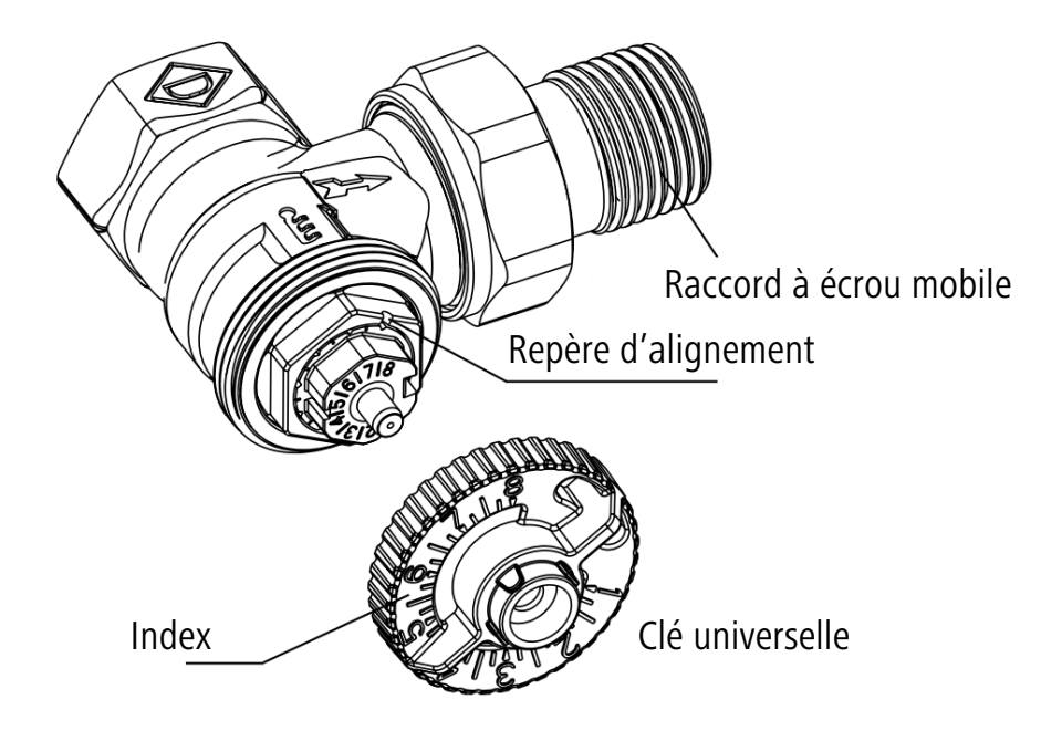 - Faire tourner l’index de la valeur de réglage souhaitée jusqu’au repère d’alignement de la tête de robinet.