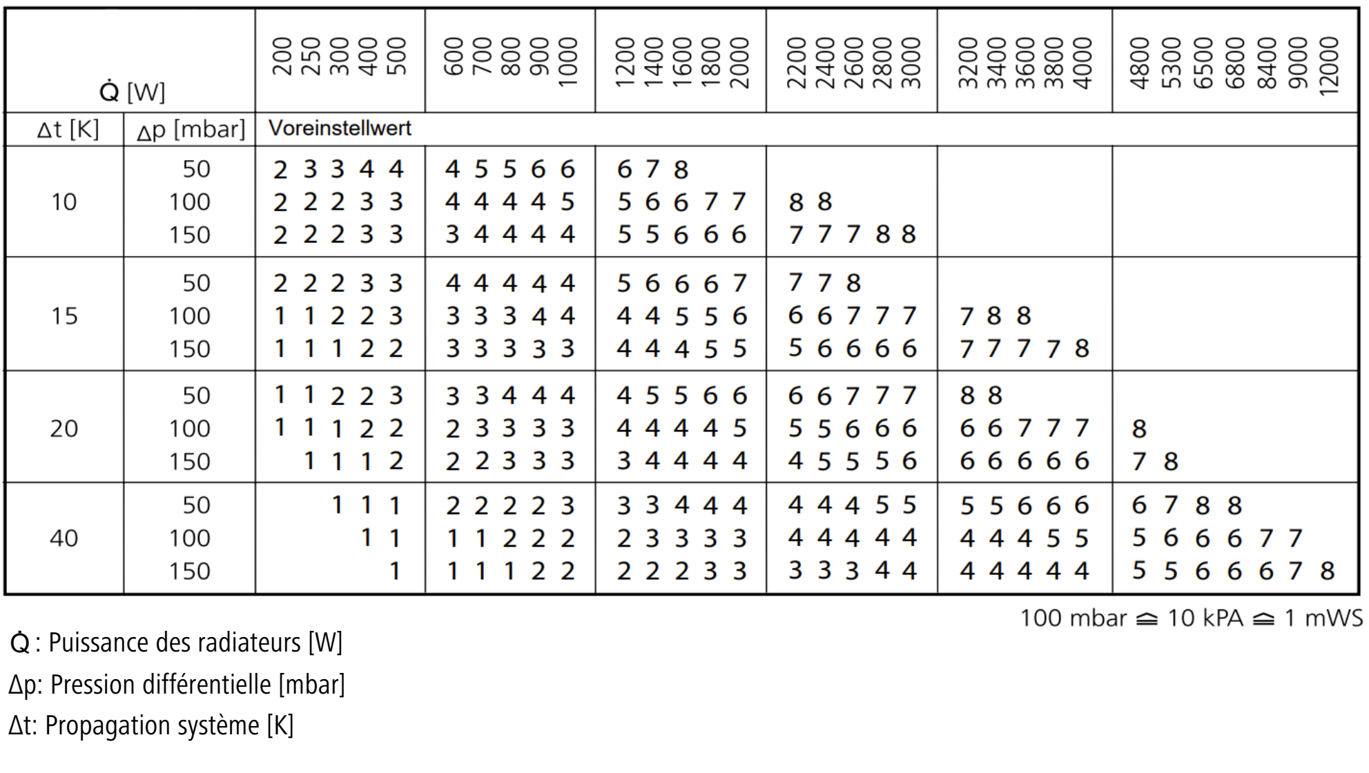 Valeurs de préréglage recommandées en fonction de la puissance des radiateurs, de la pression différentielle et de la propagation système:
