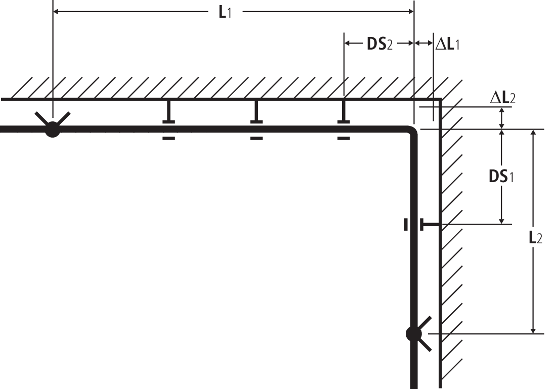 Une conduite linéaire ne comportant aucun changement de direction et qui n’est pas équipée d’un compensateur de dilatation ne doit comporter qu’un seul point fixe. Sur les longues conduites, il est conseillé de positionner le point fixe au milieu du parcours afin que la dilatation soit absorbée dans les deux directions.