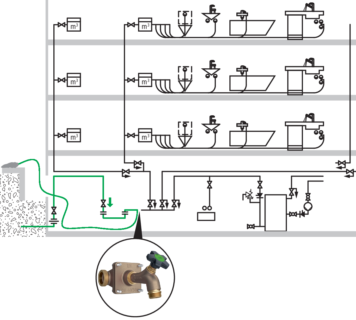 Remarque: Pour faciliter les prélèvements d’échantillons obligatoires dans le cadre de l’autocontrôle, il faut que des robinets pour prise d’échantillon soient montés aux endroits appropriés dès la réalisation de l’installation d’eau de boisson (👉 Robinets de prélèvement).