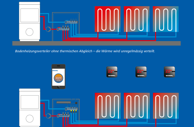 Les maîtres d’ouvrage, planificateurs techniques et chauffagistes ont fréquemment des problèmes avec les installations de chauffage au sol. Pièces surchauffées, températures fluctuantes selon la météo ou encore zones sensiblement plus froides ne sont que quelques points qui, systématiquement, produisent de l’inconfort et se traduisent par des coûts de service et d’exploitation plus élevés. C’est à ce niveau qu’intervient Therm-Control, conçu pour éliminer ces inconvénients. Le système assure la compensation thermique automatisée des divers circuits de chauffage et garantit ainsi toujours la température recherchée.