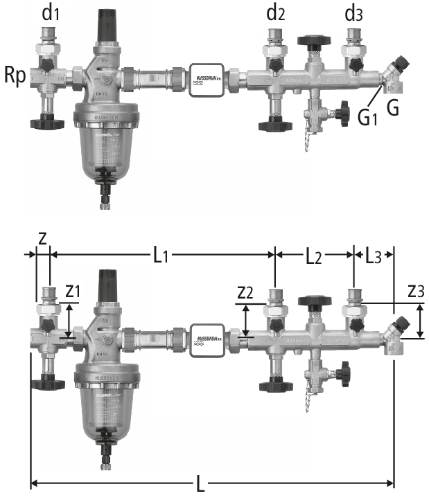 | Rp | G | G1 | d1 | d2 | d3 | z | z1 | z2 | z3 | L | L1 | L2 | L3 | Art. n° | VE | RK | VE | suissetec | ||
