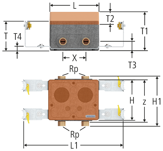 | Rp | z | L | L1 | H | H1 | T | T1 | T2 | T3 | T4 | X | Kvs | Art. n° | VE | RK | VE | suissetec | ||||