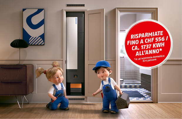 Puntate su uno scaldacqua a pompa di calore innovativo che vi offre la soluzione giusta non solo oggi ma anche domani. Aquapro-Ecotherma consuma fino al 65 % di energia elettrica in meno rispetto ai boiler elettrici convenzionali ed è quindi vantaggioso sia per l’ambiente sia per il portafogli. Grazie alle dimensioni compatte può essere installato facilmente in qualsiasi armadio standard, in sostituzione dei boiler elettrici a incasso decentralizzati. Un terzo del consumo domestico totale di energia elettrica viene utilizzato per l’acqua calda. Solo per riscaldare si necessita di più corrente.