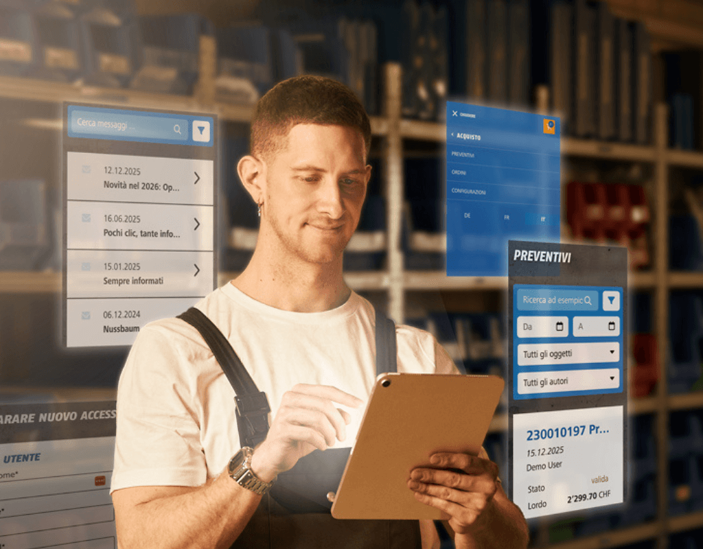 Con myNussbaum avete sempre sotto controllo i vostri progetti, ordini e documenti: in formato digitale, centralizzato e 24 ore su 24. Il portale clienti supporta le aziende di installazione, i progettisti e i team di assistenza nella semplificazione dei processi di lavoro e nel risparmio di tempo prezioso. Dall'ordinazione dei materiali alla gestione delle offerte e dei documenti, fino alle offerte di formazione, troverete tutto in un unico posto: intuitivo, efficiente e utilizzabile gratuitamente.