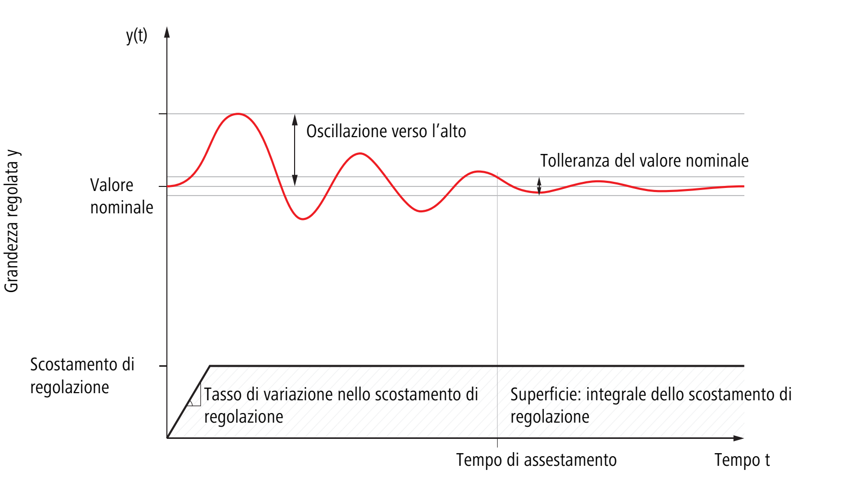 Lo schema seguente mostra, in linea generale, il comportamento di regolazione di un circuito di regolazione in presenza di uno scostamento di regolazione. Il tempo di assestamento è il tempo necessario a un circuito di regolazione per stabilizzare il valore nominale entro un intervallo di tolleranza dopo uno scostamento di regolazione.