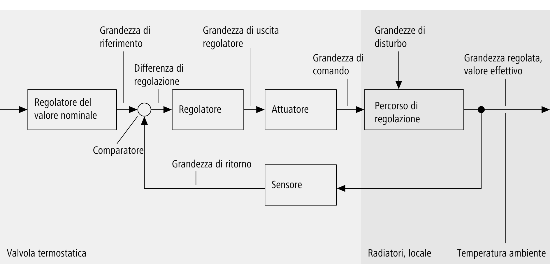 Per calcolare la grandezza di uscita del regolatore (o la grandezza di comando), un regolatore tiene conto del valore proporzionale, del tasso di variazione o dell’integrale dello scostamento di regolazione.