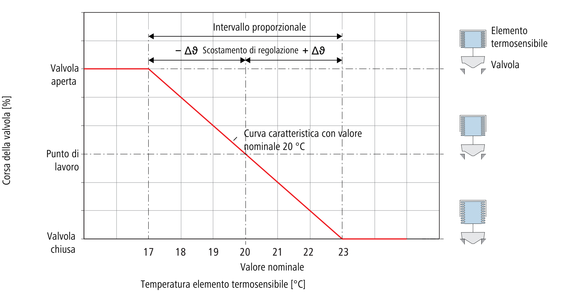 Un regolatore P varia la grandezza di comando in rapporto proporzionale allo scostamento dal valore nominale. Una regolazione senza scostamento di regolazione residuo dal valore nominale non risulta possibile in presenza di uno scostamento di regolazione permanente. |