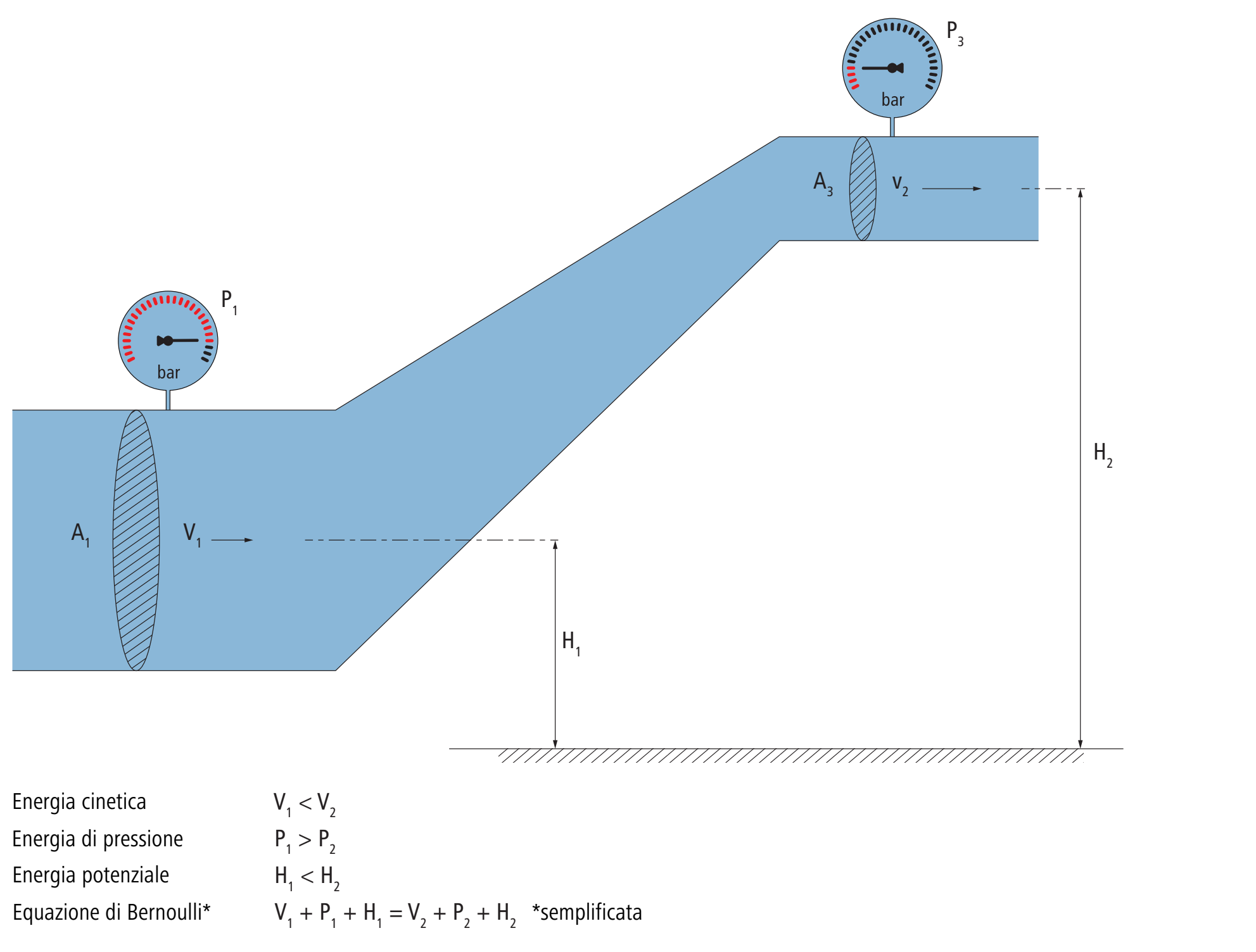 L’equazione di Bernoulli stabilisce che l’energia di un fluido che scorre attraverso una tubazione rimane costante in qualsiasi punto della stessa (principio di conservazione dell’energia: l’energia non può essere né creata né distrutta). L’energia di scorrimento del fluido è costituita dall’energia cinetica, dall’energia di pressione e dall’energia potenziale. L’energia cinetica è data dal movimento del fluido all’interno della tubazione. L’energia di pressione è il risultato del movimento degli atomi e delle molecole nel fluido. L’energia potenziale è l’energia che corrisponde all’altezza di caduta del fluido rispetto a un piano di riferimento nel campo gravitazionale terrestre.