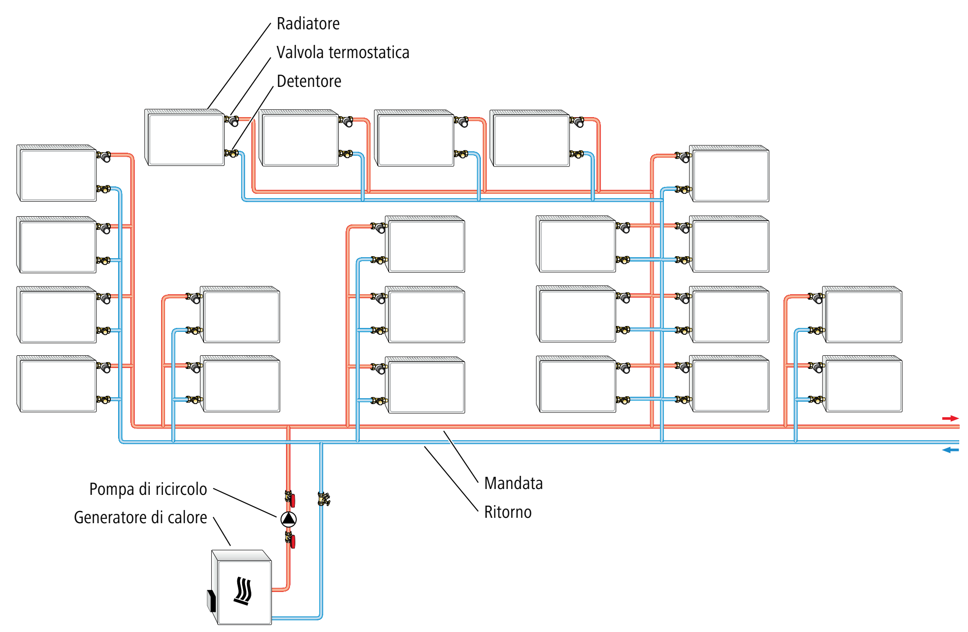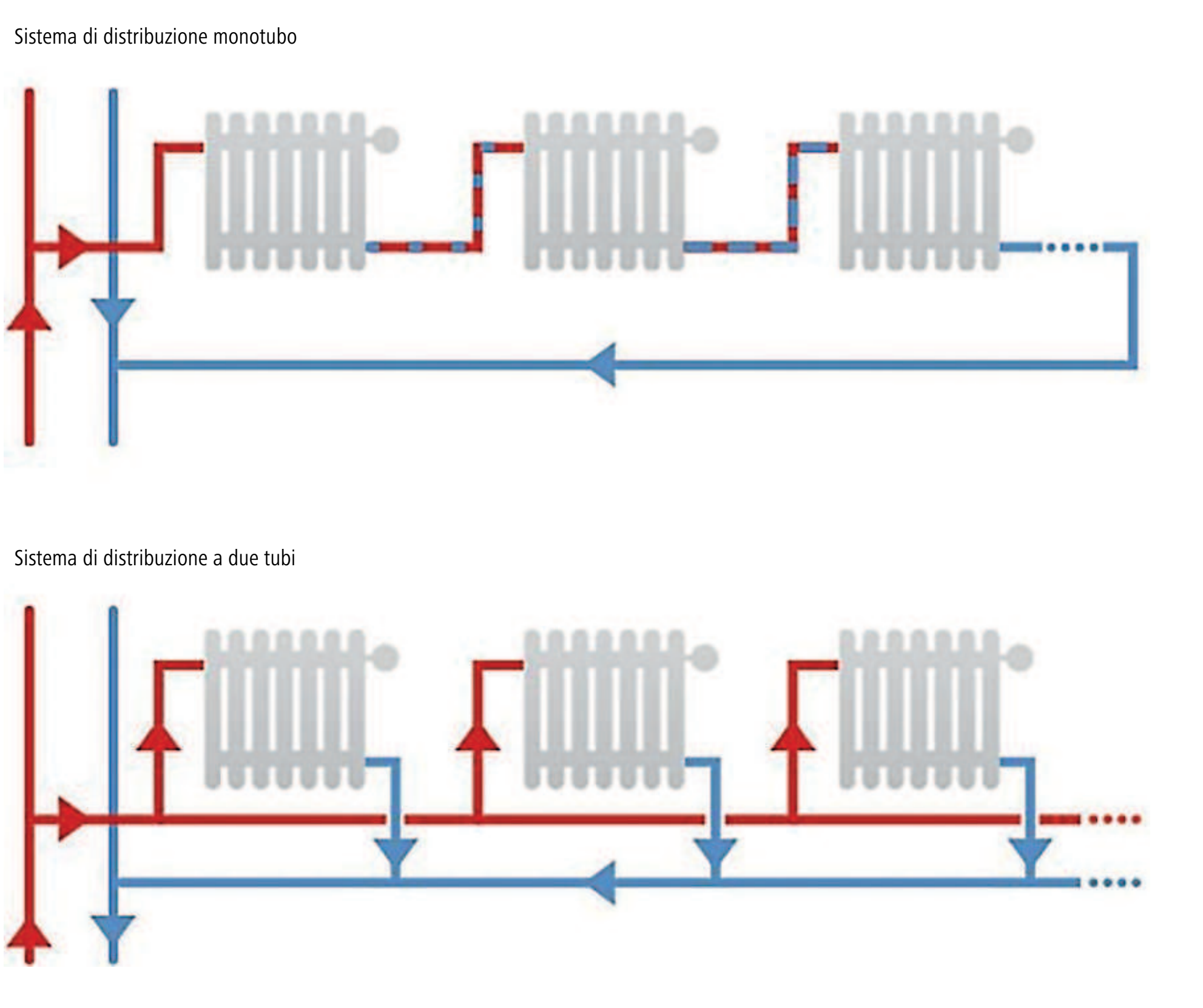 Negli impianti di riscaldamento monotubo, i radiatori vengono attraversati, in successione, da acqua di riscaldamento calda che scorre in una tubazione circolare. Negli impianti a due tubi, i radiatori sono collegati a un distributore centrale attraverso una mandata e un ritorno.