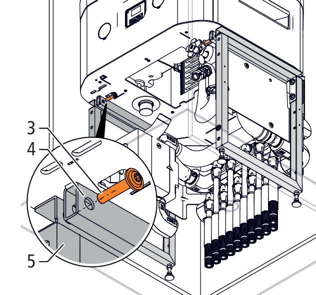 - Posizionare il tubo per condensa (3) sul nippel (4) dell’apparecchio e fissarlo per mezzo della fascetta stringitubo (5). Portare il tubo per condensa sullo scarico e fissarlo in un punto adeguato per mezzo di una fascetta.