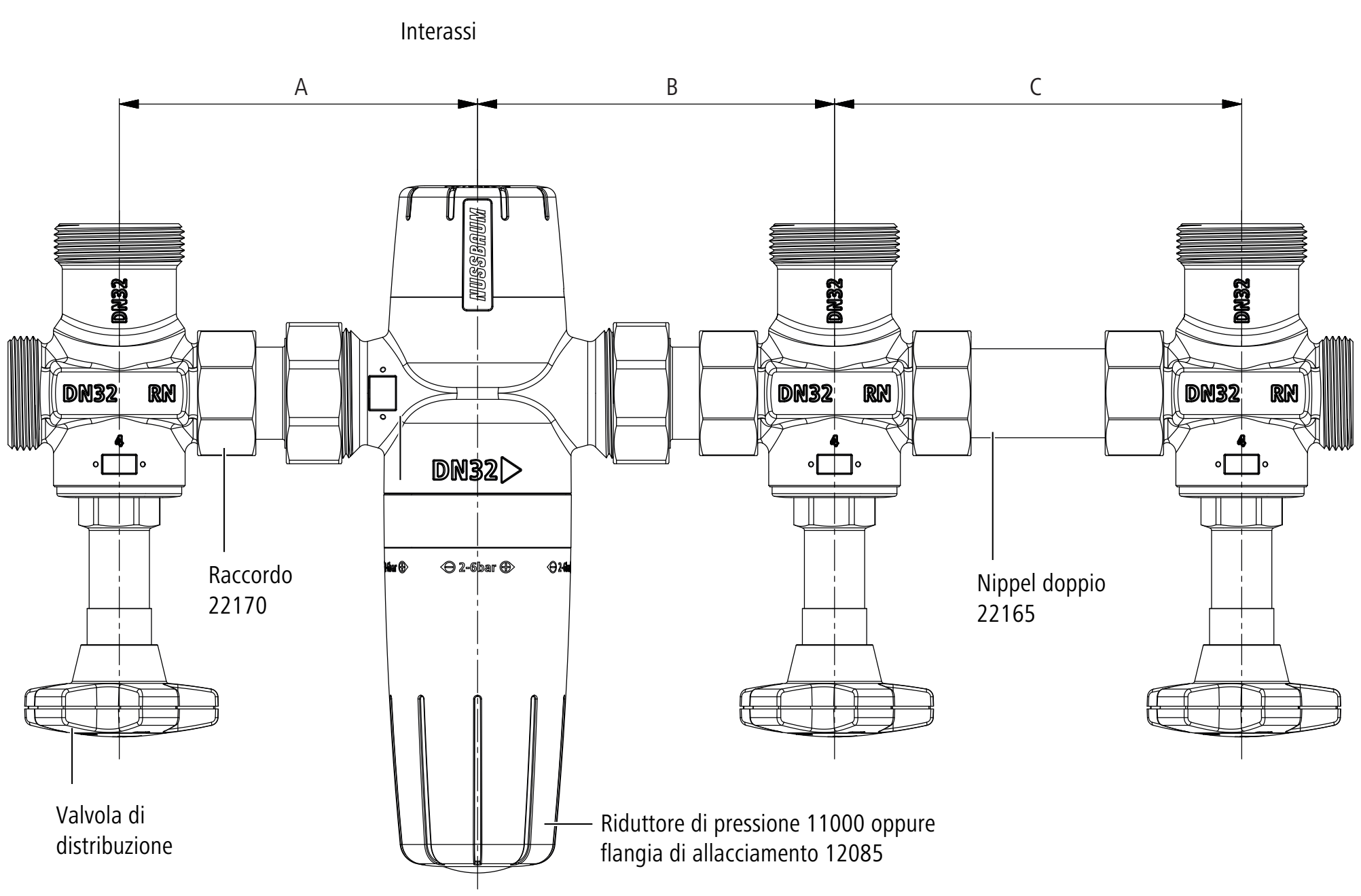 Gli interassi tra le valvole di distribuzione dipendono dalla misura (DN) della rubinetteria e dei fitting impiegati: