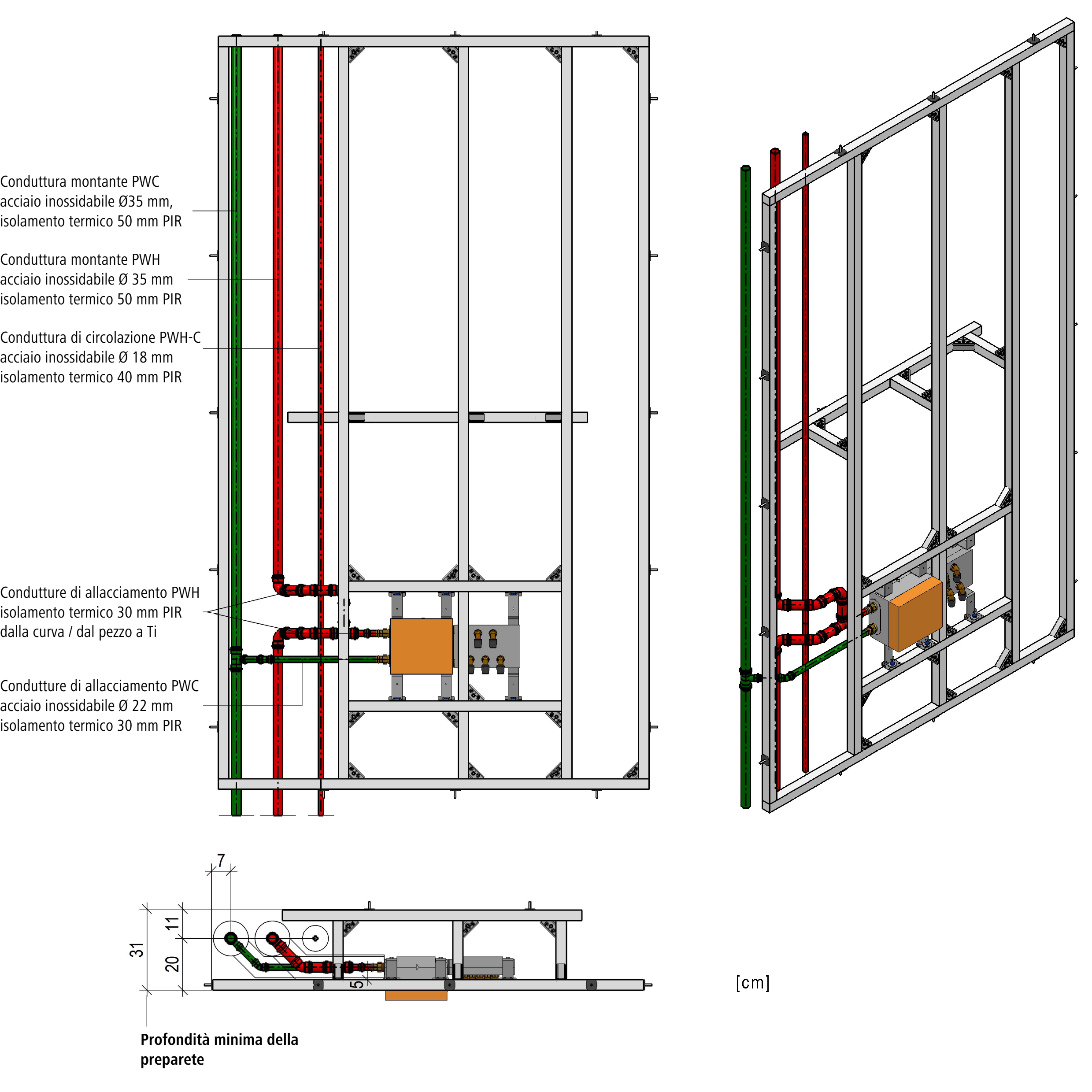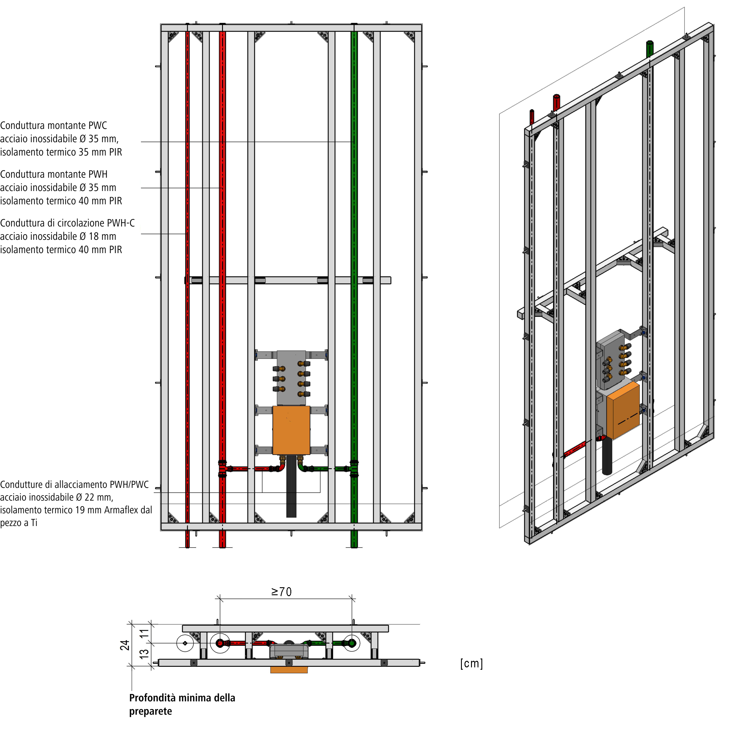 Qui di seguito vengono proposti tre esempi pratici di installazioni premurali. Un esempio mostra una soluzione con isolamento termico rinforzato delle condutture dell’acqua fredda. Gli altri esempi mostrano possibili soluzioni in cui la separazione termica viene realizzata attraverso una distanza minima tra le condutture montanti.